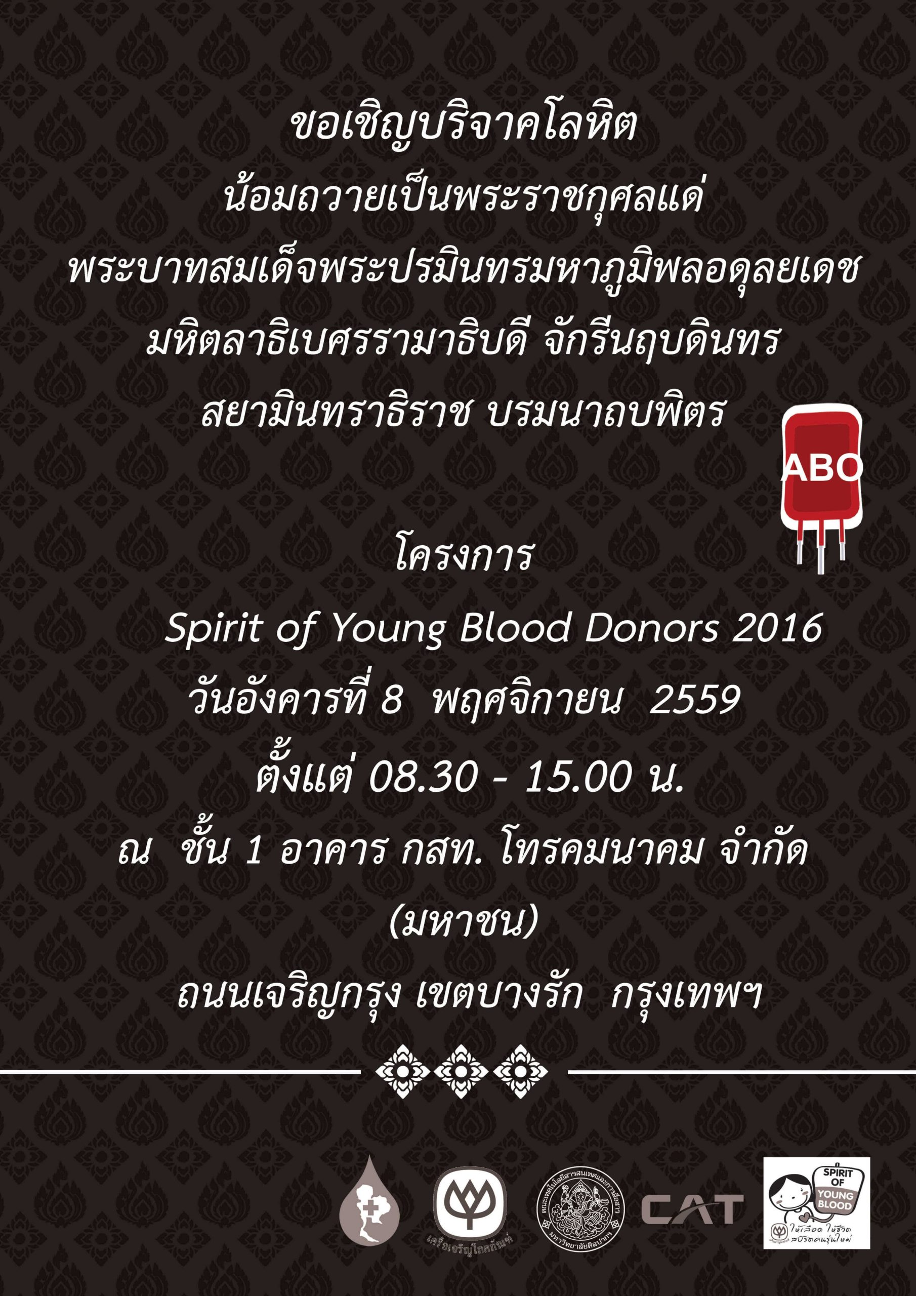 สภากาชาดไทย ร่วมกับเครือเจริญโภคภัณฑ์ คณะเทคโนโลยีสารสนเทศและการสื่อสาร มหาวิทยาลัยศิลปากร และ กสท. โทรคมนาคม ขอเชิญบริจาคโลหิต น้อมถวายเป็นพระราชกุศลแด่ พระบาทสมเด็จพระปรมินทรมหาภูมิพลอดุลยเดช มหิตลาธิเบศรรามาธิบดี จักรีนฤบดินทร สยามินทราธิราช บรมนาถบพิตรในโครงการ Spirit of Young Blood Donor 2016 วันอังคารที่ 8 พฤศจิกายน 2559 ตั้งแต่เวลา 08.30 – 15.00 น. ณ ชั้น 1 อาคาร กสท. โทรคมนาคม จำกัด ถนนเจริญกรุง เขตบางรัก กรุงเทพฯ